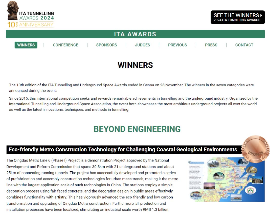 في سبتمبر 2024، أُقيمت الدورة العاشرة من جائزة ITA للأنفاق، المعروفة بـ"أوسكار" صناعة الأنفاق العالمية، في جنوة بإيطاليا. وقد برز مشروع "المرحلة الأولى من خط مترو تشينغداو السادس"، الذي نفّذته شركة شاندونغ أنتيك للمواد الهندسية المحدودة، من بين العديد من المشاريع العالمية، وفاز بجائزة "ما وراء الهندسة". وبذلك، أصبح المشروع الصيني الوحيد الذي حاز على هذه الجائزة في ذلك العام.
